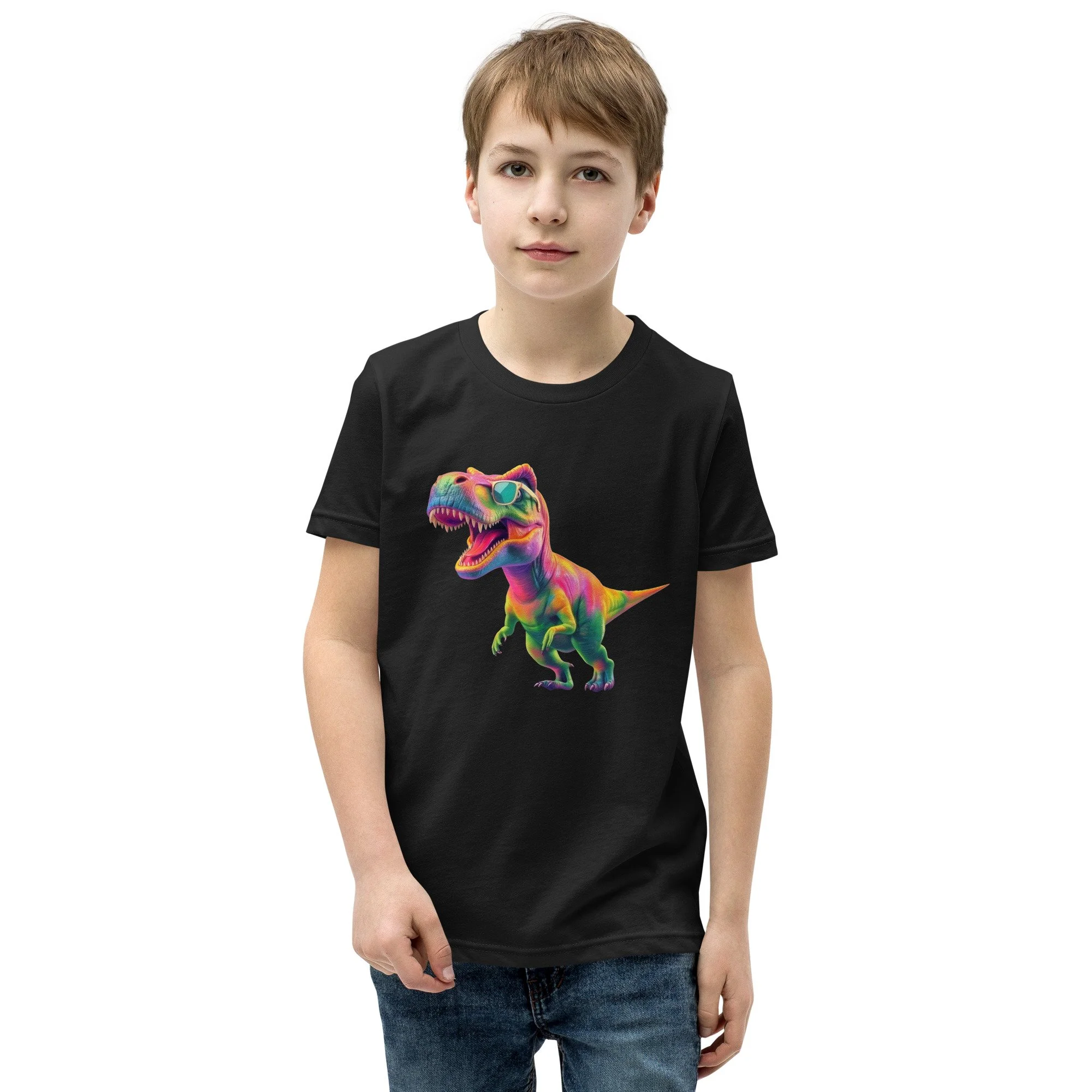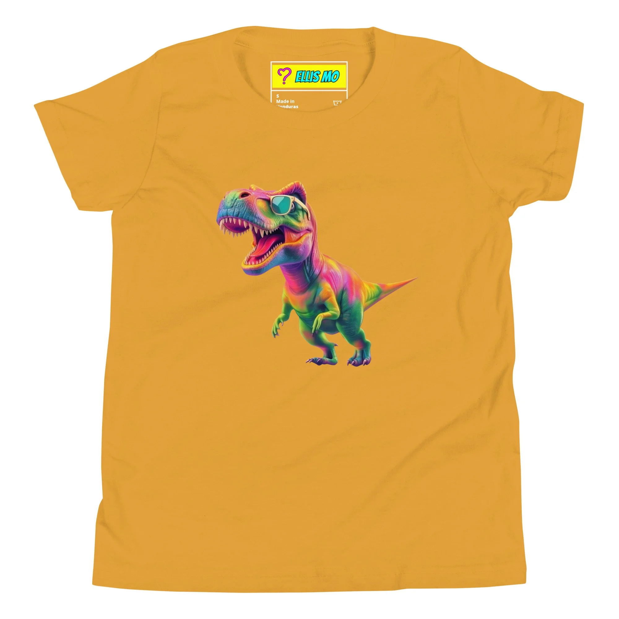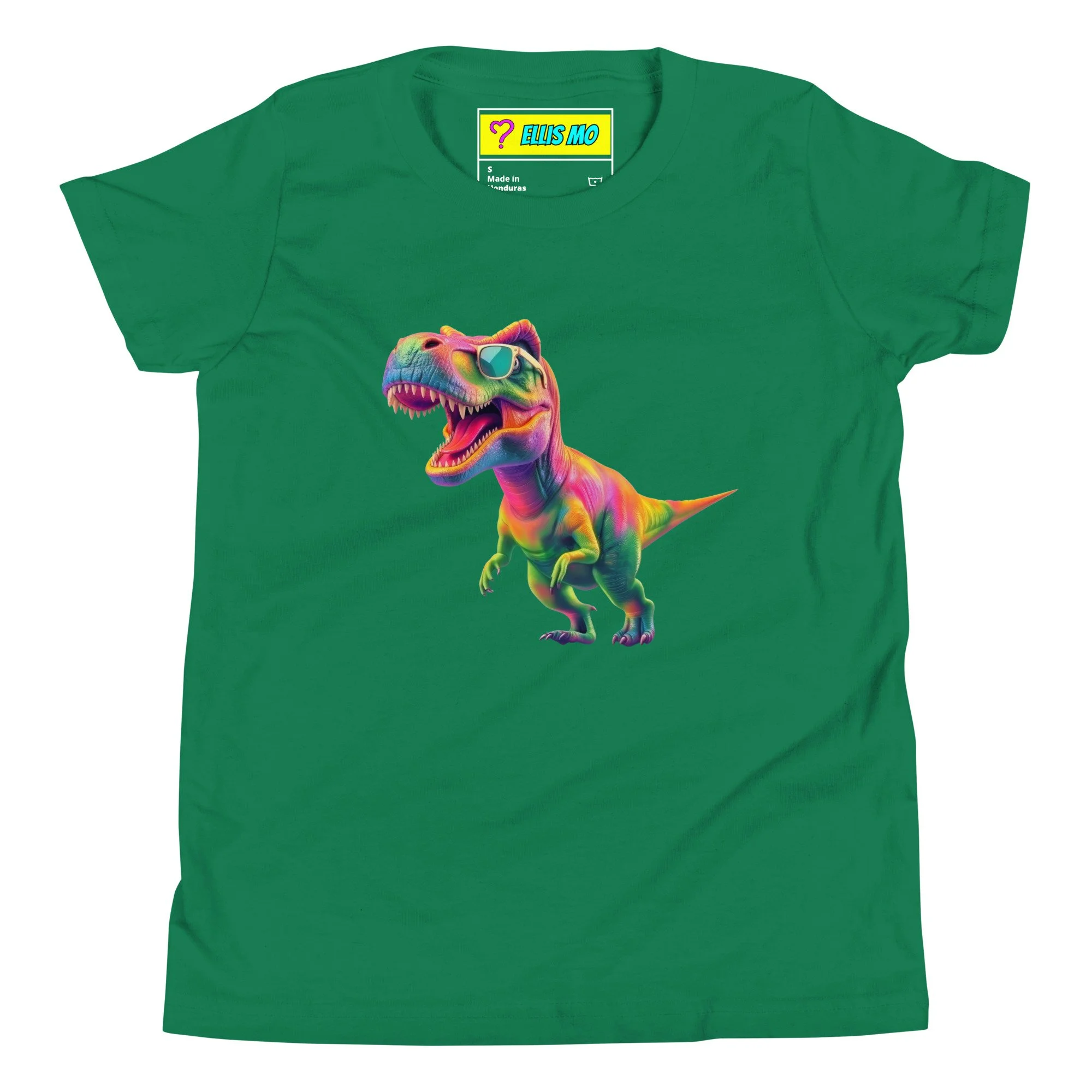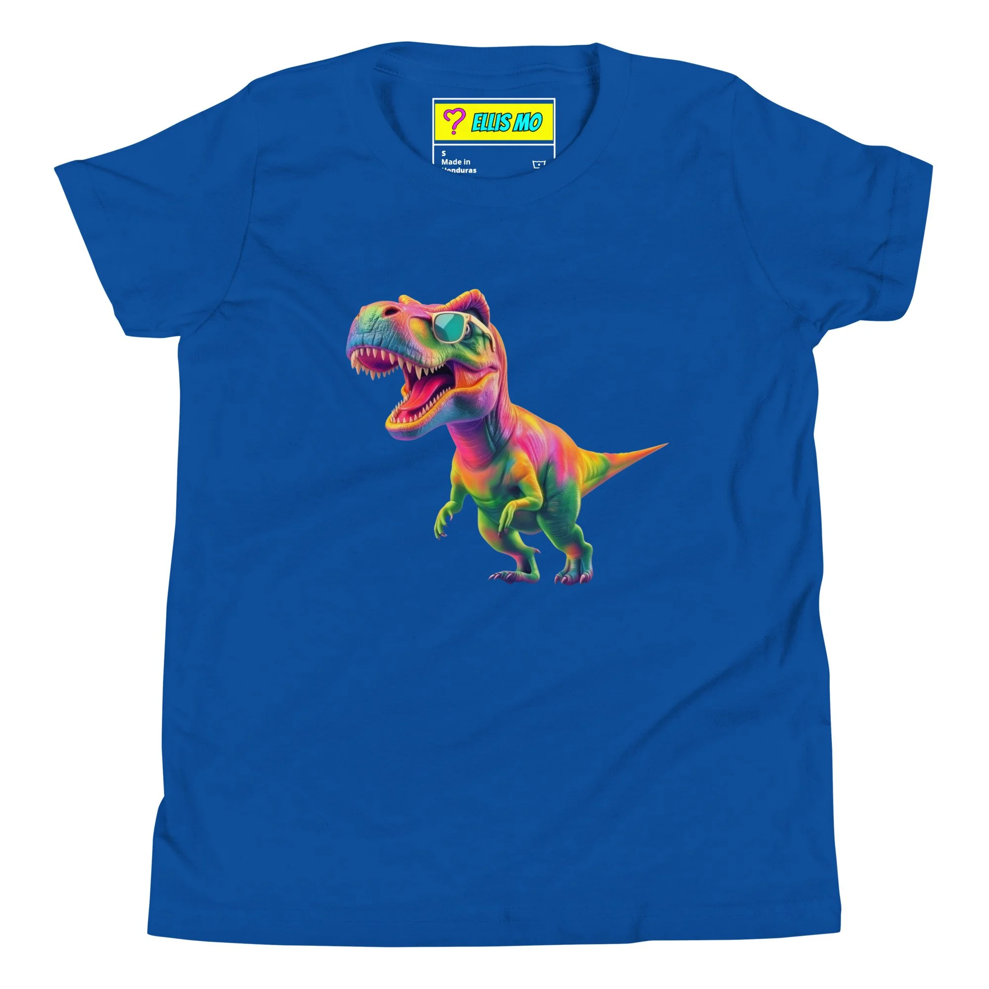 This technicolor T-Rex didn’t come to blend in — he came to headline the asteroid after-party. Sunglasses on. Toothy smile activated. Full rainbow roar mode on.